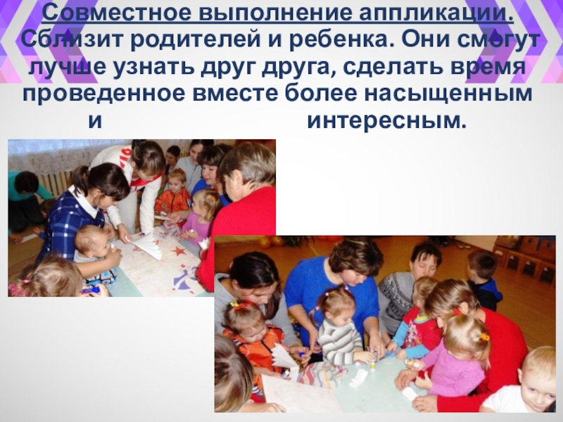 Слайд 5Совместное выполнение аппликации. Сблизит родителей и ребенка. Они смогут лучше узнать