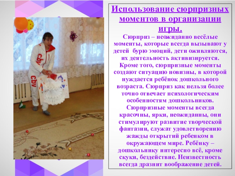 Использование сюрпризных моментов в организации игры. Сюрприз – неожиданно весёлые моменты, которые всегда вызывают у детей бурю