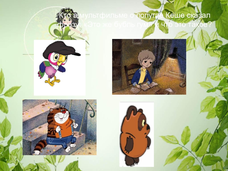 Слайд 4Кто в мультфильме о попугае Кеше сказал фразу: «Это же бубль