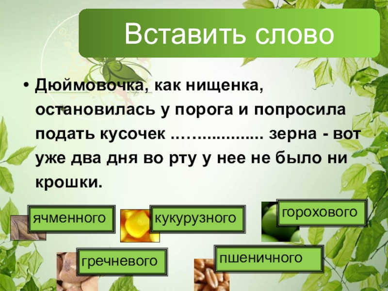 Вставить словоДюймовочка, как нищенка,  остановилась у порога и попросила  подать кусочек ..….............. зерна - вот