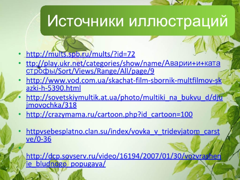 Источники иллюстрацийhttp://mults.spb.ru/mults/?id=72ttp://play.ukr.net/categories/show/name/Аварии+и+катастрофы/Sort/Views/Range/All/page/9http://www.vod.com.ua/skachat-film-sbornik-multfilmov-skazki-h-5390.htmlhttp://sovetskiymultik.at.ua/photo/multiki_na_bukvu_d/djujmovochka/318http://crazymama.ru/cartoon.php?id_cartoon=100  httpvsebesplatno.clan.su/index/vovka_v_tridevjatom_carstve/0-36  http://dcp.sovserv.ru/video/16194/2007/01/30/vozvrashenie_bludnogo_popugaya/
