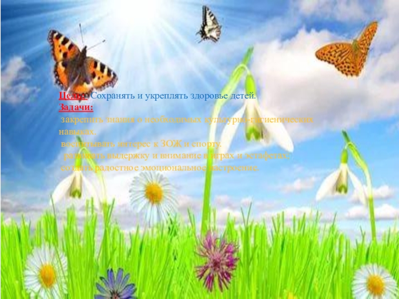 Цель: Сохранять и укреплять здоровье детей.Задачи: закрепить знания о необходимых культурно-гигиенических навыках. воспитывать интерес к ЗОЖ и спорту. развивать выдержку и внимание в играх и эстафетах; создать радостное эмоциональное настроение.