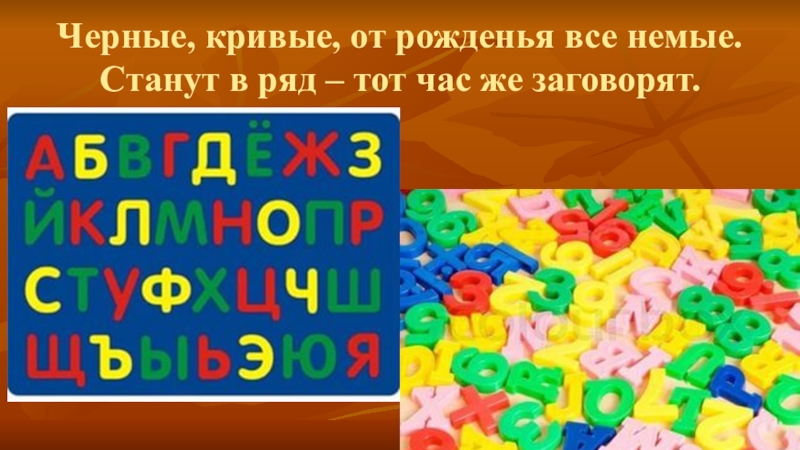 Слайд 24Черные, кривые, от рожденья все немые. Станут в ряд – тот