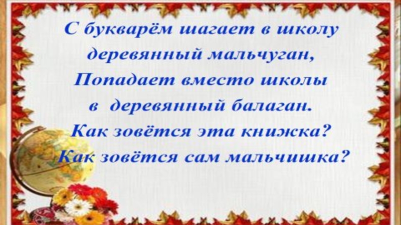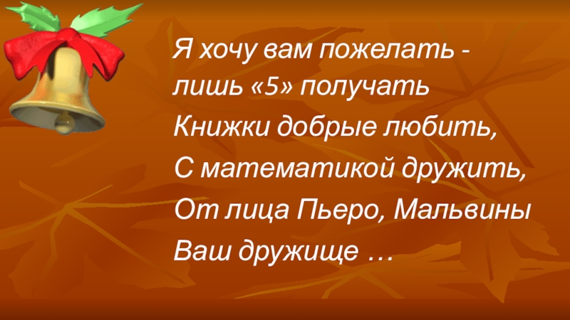 Я хочу вам пожелать - лишь «5» получатьКнижки добрые любить,С математикой дружить,От лица Пьеро, МальвиныВаш дружище …