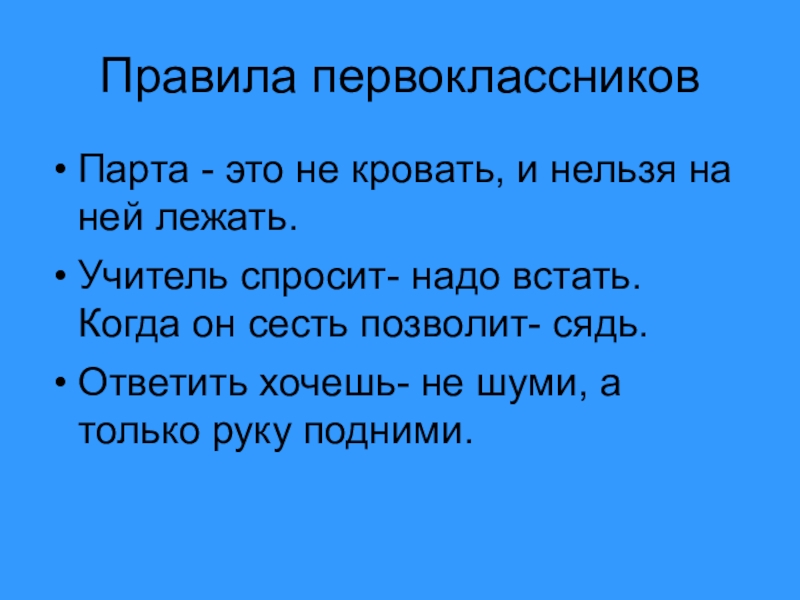 Правила первоклассниковПарта - это не кровать, и нельзя на ней лежать.Учитель спросит- надо встать. Когда он сесть