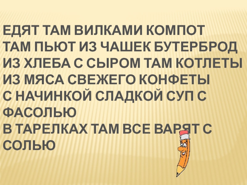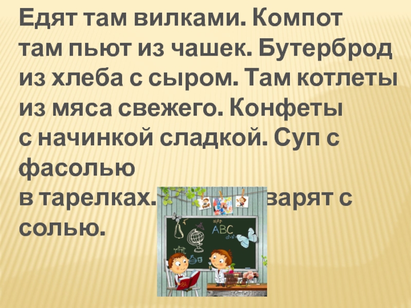 ЕДЯТ ТАМ ВИЛКАМИ КОМПОТТАМ ПЬЮТ ИЗ ЧАШЕК БУТЕРБРОДИЗ ХЛЕБА С СЫРОМ ТАМ КОТЛЕТЫИЗ МЯСА СВЕЖЕГО КОНФЕТЫС НАЧИНКОЙ
