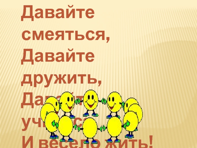 Давайте смеяться,Давайте дружить,Давайте учитьсяИ весело жить!