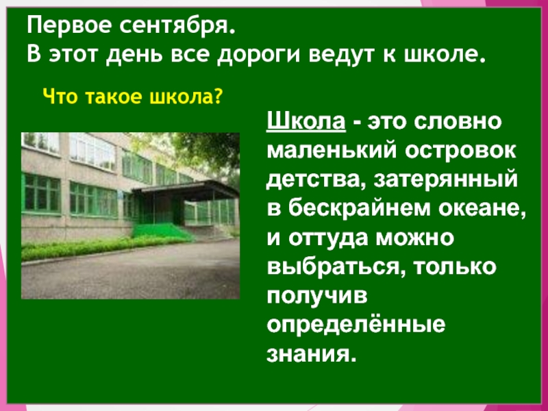 Школа - это словно маленький островок детства, затерянный в бескрайнем океане, и оттуда можно выбраться, только получив определённые знания.