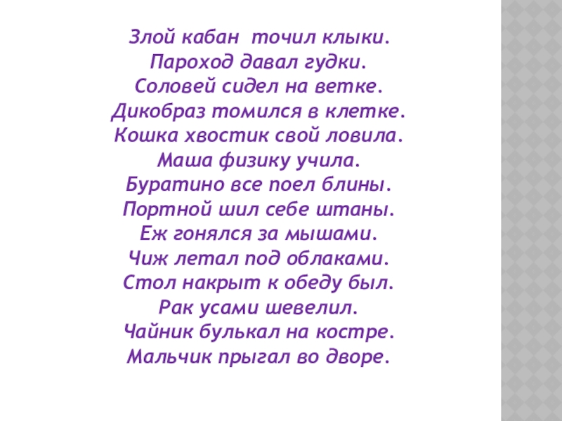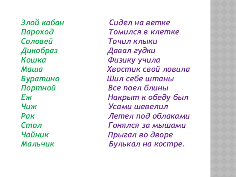 Сидел на ветке Пароход Томился в клетке Соловей Точил клыки Дикобраз Давал гудки Кошка Физику учила Маша Хвостик свой ловила Буратино Шил себе штаны Портной Все поел блины Еж Накрыт к обеду был Чиж Усами шевелил Рак Летел под облаками Стол Гонялся за мышами Чайник Прыгал во дворе Мальчик Булькал на костре.