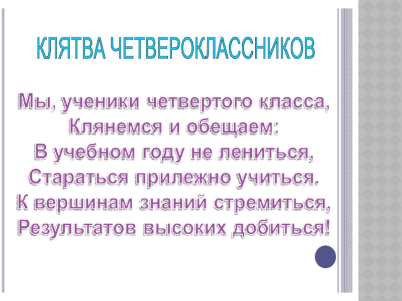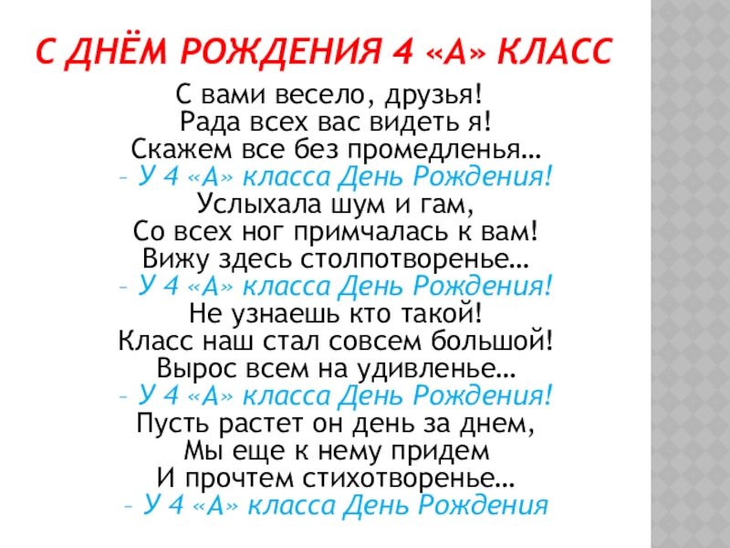 вас видеть я! Скажем все без промедленья… – У 4 «А» класса День Рождения! Услыхала шум и гам, Со всех ног примчалась к вам! Вижу здесь столпотворенье… – У 4 «А» класса День Рождения! Не узнаешь кто такой! Класс наш стал совсем большой! Вырос всем на удивленье… – У 4 «А» класса День Рождения! Пусть растет он день за днем, Мы еще к нему придем И прочтем стихотворенье… – У 4 «А» класса День Рождения