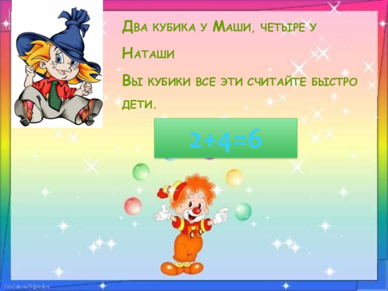 ДВА КУБИКА У МАШИ, ЧЕТЫРЕ У НАТАШИВЫ КУБИКИ ВСЕ ЭТИ СЧИТАЙТЕ БЫСТРО ДЕТИ.2+4=6