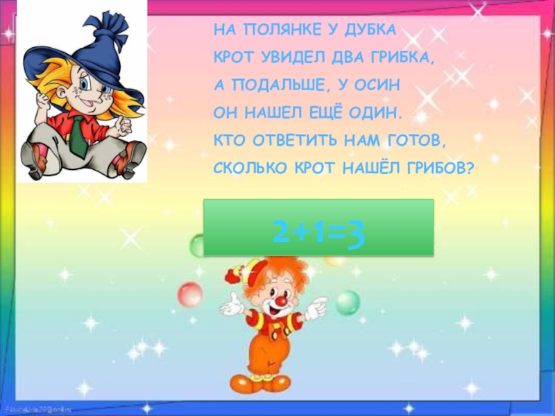 НА ПОЛЯНКЕ У ДУБКАКРОТ УВИДЕЛ ДВА ГРИБКА,А ПОДАЛЬШЕ, У ОСИНОН НАШЕЛ ЕЩЁ ОДИН.КТО ОТВЕТИТЬ НАМ ГОТОВ,СКОЛЬКО КРОТ