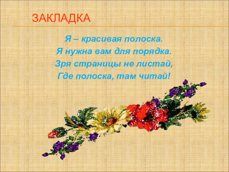 ЗАКЛАДКАЯ – красивая полоска.Я нужна вам для порядка.Зря страницы не листай,Где полоска, там читай!