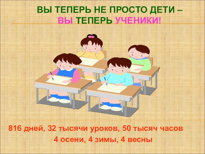 ВЫ ТЕПЕРЬ НЕ ПРОСТО ДЕТИ –  ВЫ ТЕПЕРЬ УЧЕНИКИ!816 дней, 32 тысячи уроков, 50 тысяч часов4
