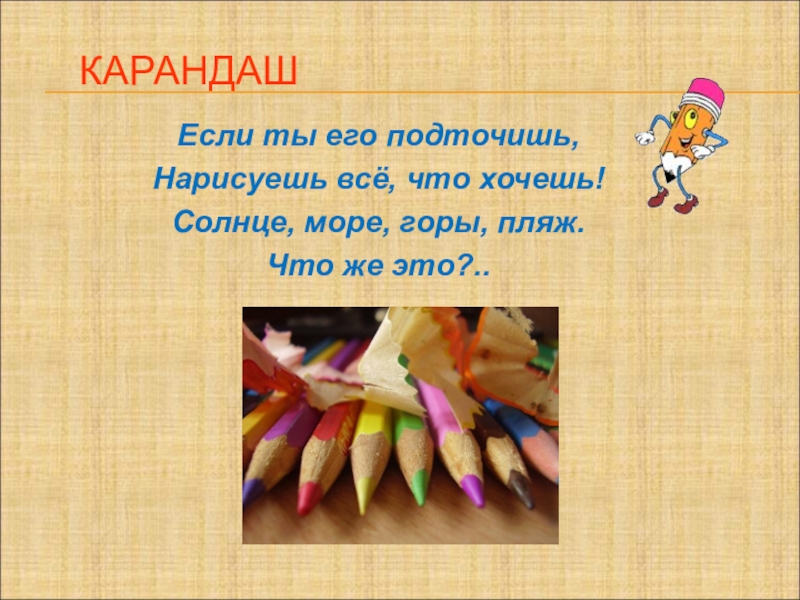 КАРАНДАШЕсли ты его подточишь,Нарисуешь всё, что хочешь!Солнце, море, горы, пляж.Что же это?..