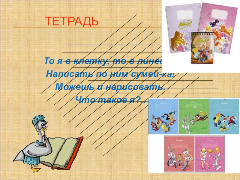 ТЕТРАДЬТо я в клетку, то в линейку,Написать по ним сумей-ка!Можешь и нарисовать.Что такое я?..