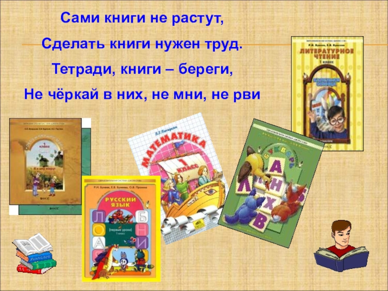 Сами книги не растут,Сделать книги нужен труд.Тетради, книги – береги,Не чёркай в них, не мни, не рви