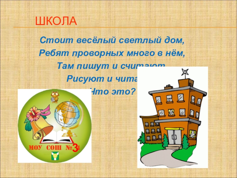 ШКОЛАСтоит весёлый светлый дом,Ребят проворных много в нём,Там пишут и считают, Рисуют и читают.Что это?3