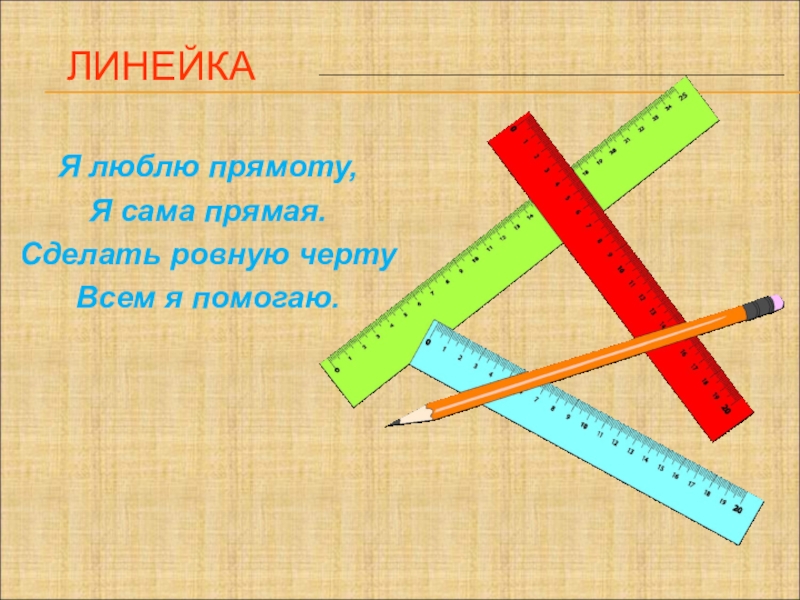 ЛИНЕЙКАЯ люблю прямоту,Я сама прямая.Сделать ровную чертуВсем я помогаю.