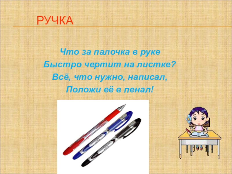 РУЧКАЧто за палочка в рукеБыстро чертит на листке?Всё, что нужно, написал,Положи её в пенал!