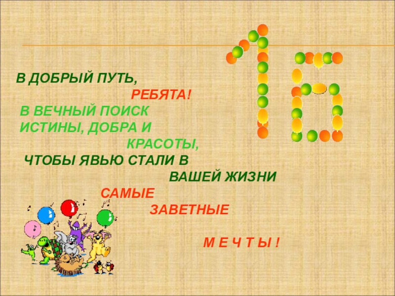 РЕБЯТА! В ВЕЧНЫЙ ПОИСК ИСТИНЫ, ДОБРА И КРАСОТЫ, ЧТОБЫ ЯВЬЮ СТАЛИ В ВАШЕЙ ЖИЗНИ САМЫЕ ЗАВЕТНЫЕ М Е Ч Т Ы !