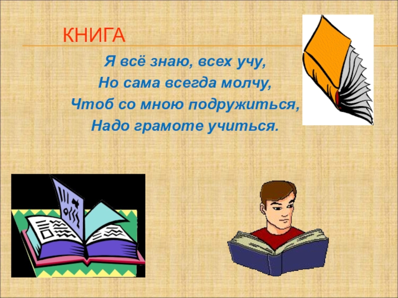КНИГАЯ всё знаю, всех учу,Но сама всегда молчу,Чтоб со мною подружиться,Надо грамоте учиться.