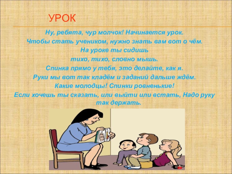 УРОКНу, ребята, чур молчок! Начинается урок.Чтобы стать учеником, нужно знать вам вот о чём.На уроке ты сидишь