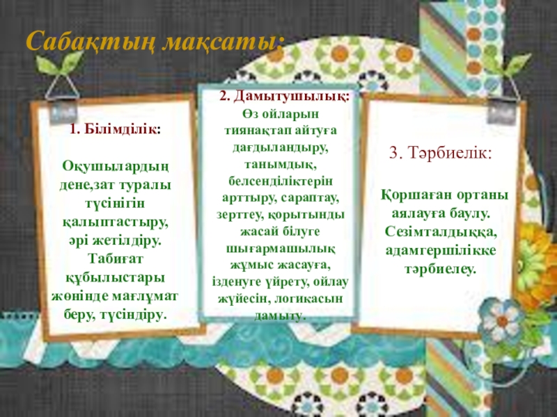 Өз ойларын тиянақтап айтуға дағдыландыру, танымдық, белсенділіктерін арттыру, сараптау, зерттеу, қорытынды жасай білуге шығармашылық жұмыс жасауға,ізденуге үйрету, ойлау жүйесін, логикасын дамыту.