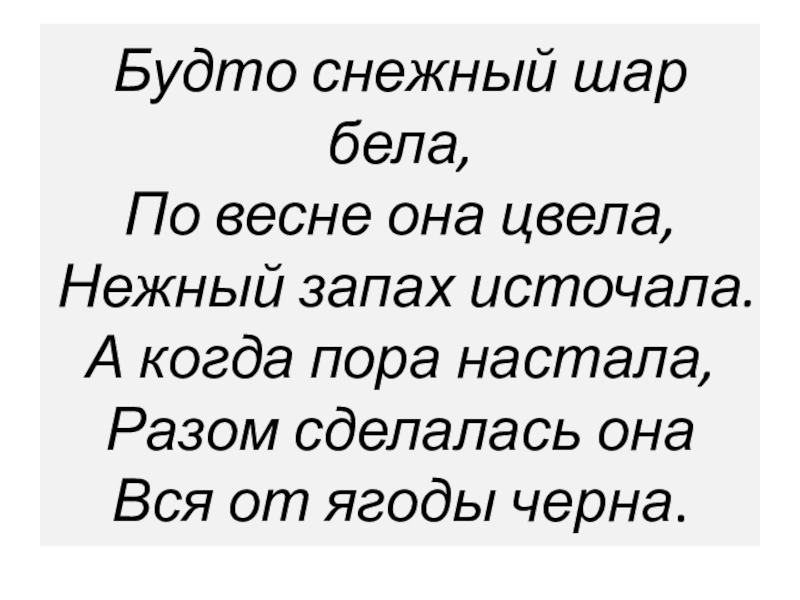 Будто снежный шар бела,  По весне она цвела,  Нежный запах источала.  А когда пора