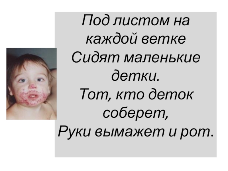 Слайд 12Под листом на каждой ветке Сидят маленькие детки. Тот, кто деток соберет, Руки вымажет