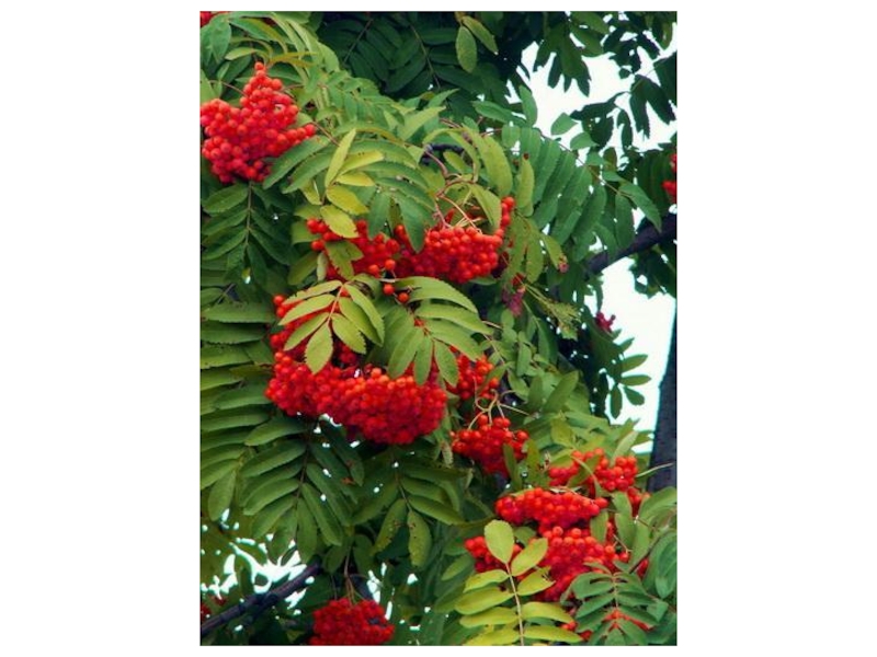 9. Лиственное дерево с плодами, собранными в гроздья, зимой ими питаются снегири, дрозды.