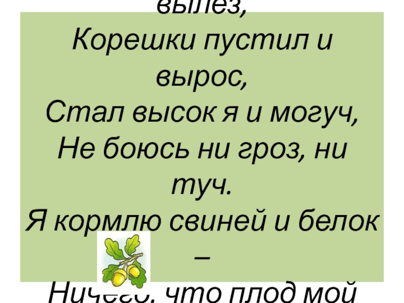 Слайд 18Я из крошки-бочки вылез, Корешки пустил и вырос, Стал высок я и