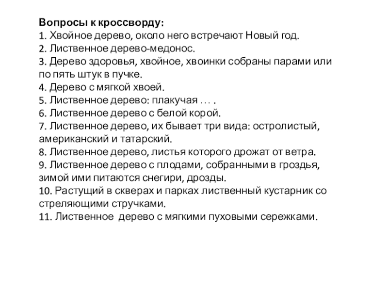 Вопросы к кроссворду:1. Хвойное дерево, около него встречают Новый год. 2. Лиственное дерево-медонос. 3. Дерево здоровья, хвойное,
