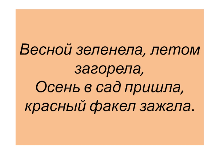 Слайд 20Весной зеленела, летом загорела, Осень в сад пришла, красный факел зажгла.