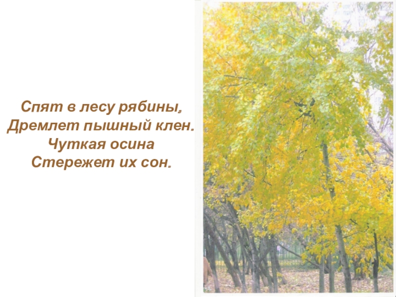 Слайд 8Спят в лесу рябины, Дремлет пышный клен. Чуткая осина Стережет их сон.