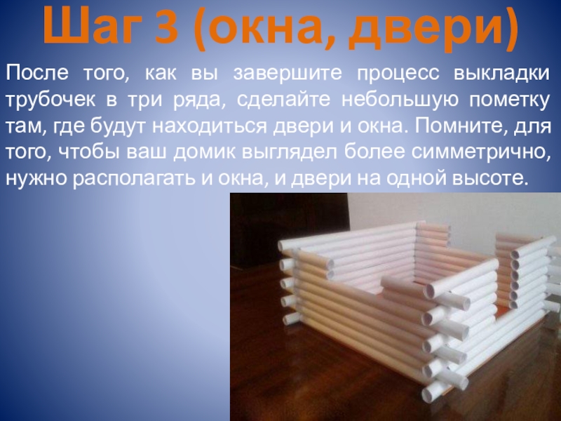 Шаг 3 (окна, двери)После того, как вы завершите процесс выкладки трубочек в три ряда, сделайте небольшую пометку
