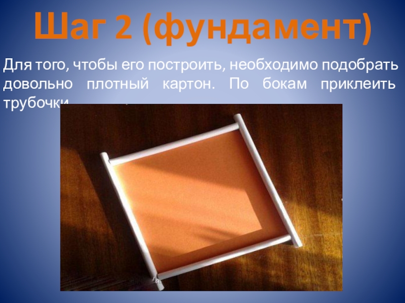 Шаг 2 (фундамент)Для того, чтобы его построить, необходимо подобрать довольно плотный картон. По бокам приклеить трубочки.