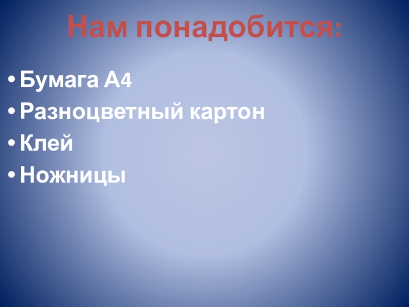 Нам понадобится:Бумага А4Разноцветный картонКлейНожницы