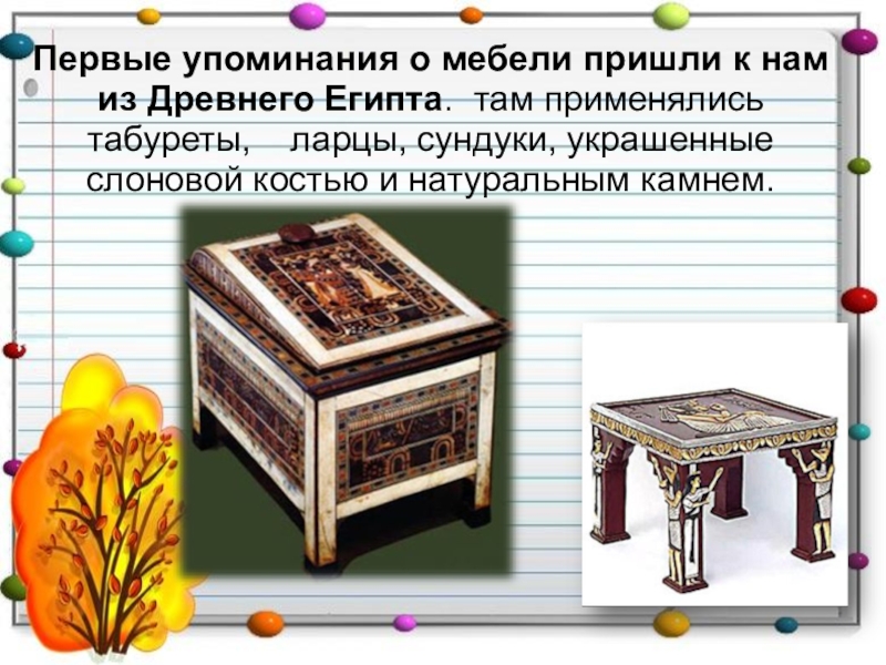 Слайд 2Первые упоминания о мебели пришли к нам из Древнего Египта. там