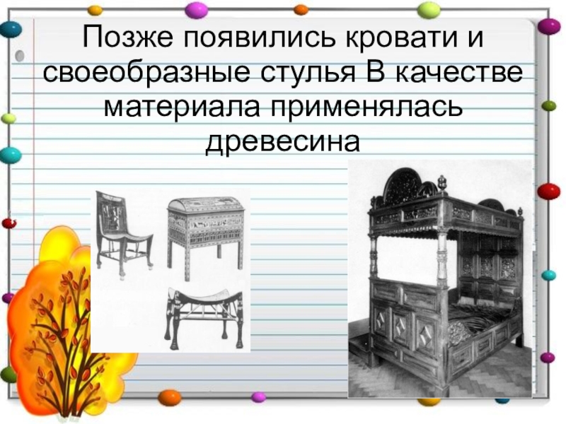 Слайд 5Позже появились кровати и своеобразные стулья В качестве материала применялась древесина