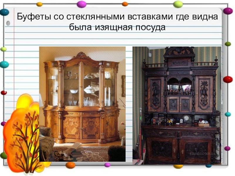 Слайд 23Буфеты со стеклянными вставками где видна была изящная посуда