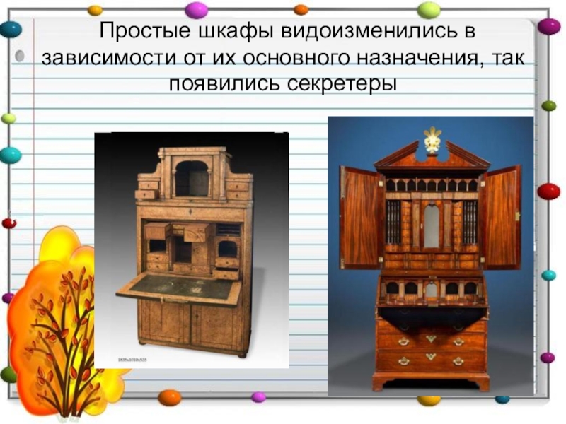 Простые шкафы видоизменились в зависимости от их основного назначения, так появились секретеры