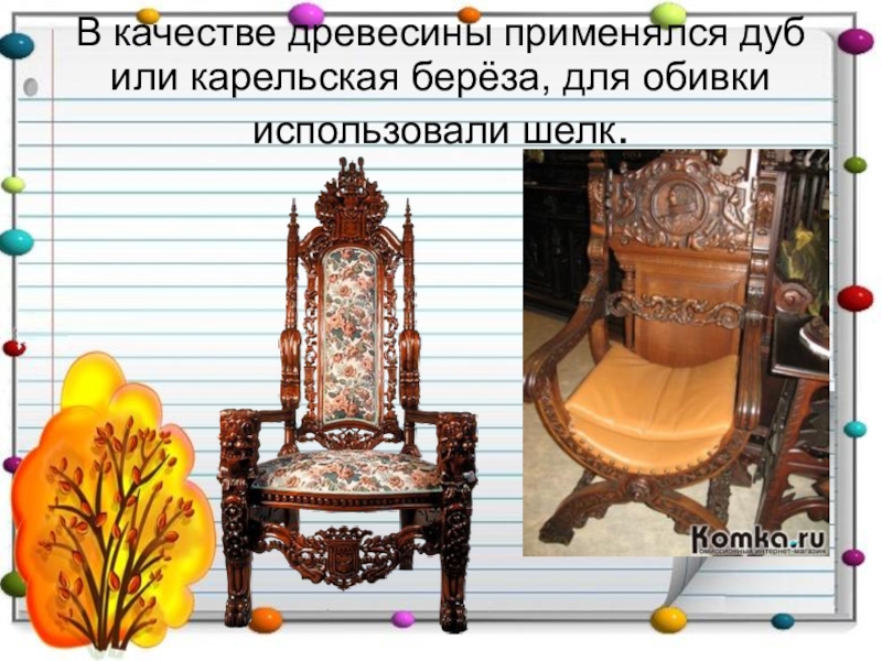 Слайд 21В качестве древесины применялся дуб или карельская берёза, для обивки использовали