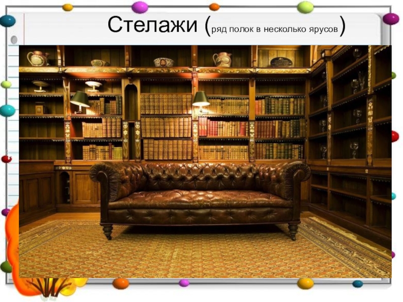 Слайд 18 Стелажи (ряд полок в несколько ярусов)