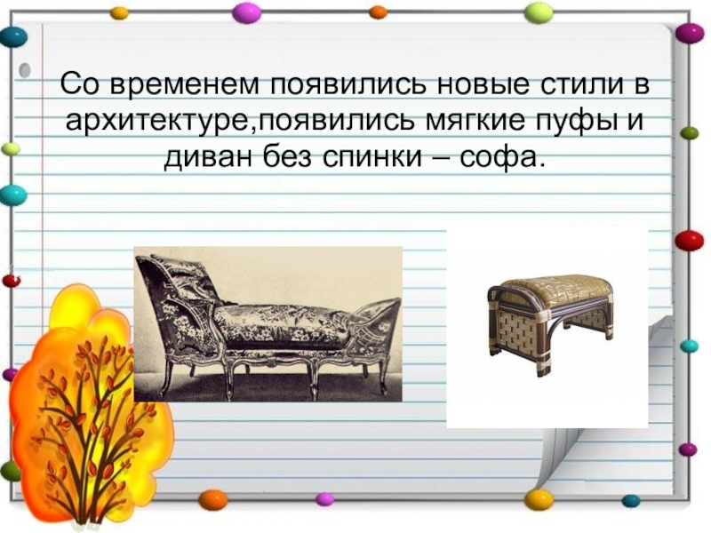 Слайд 15Со временем появились новые стили в архитектуре,появились мягкие пуфы и диван