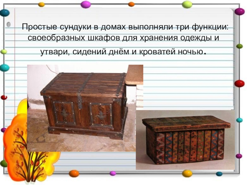 Слайд 6 Простые сундуки в домах выполняли три функции: своеобразных шкафов для