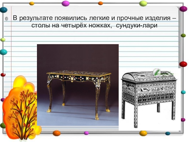 В результате появились легкие и прочные изделия – столы на четырёх ножках, сундуки-лари