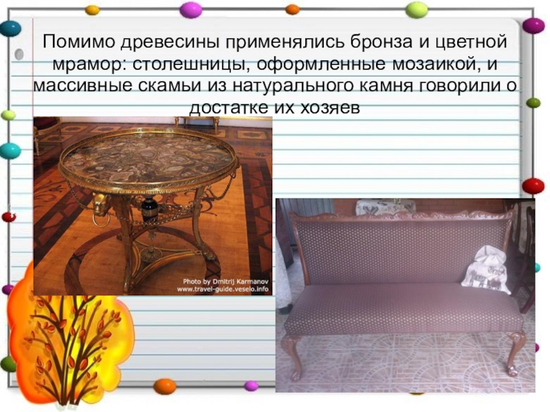 Слайд 7Помимо древесины применялись бронза и цветной мрамор: столешницы, оформленные мозаикой, и