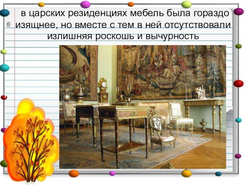 Слайд 20 в царских резиденциях мебель была гораздо изящнее, но вместе с