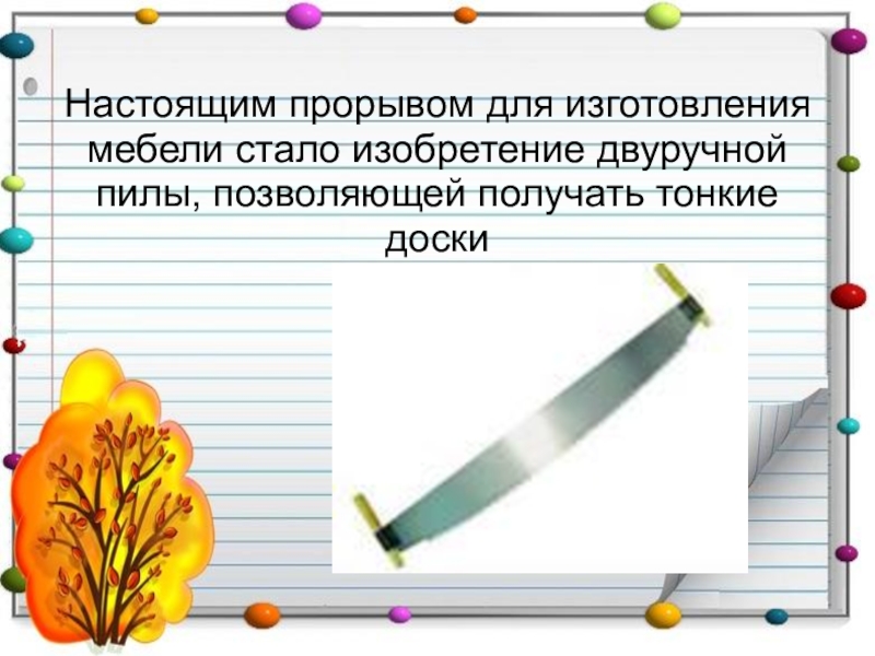 Слайд 10Настоящим прорывом для изготовления мебели стало изобретение двуручной пилы, позволяющей получать